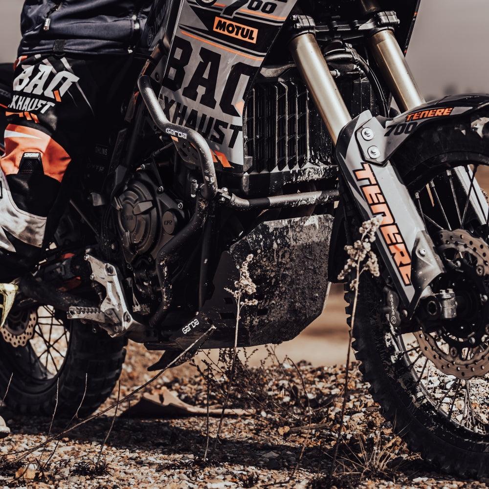 GARDA PRO Crash Bars Yamaha Tenere Explore – euro 4, euro 5. They are designed to protect the motorcycle in the harshest conditions. The main part of them is 25x2mm pipe, which is designed to withstand heavy loads. The basis of the crash bars are 3 support points per side, which gives us maximum support of the structure with optimal distribution of forces to all points. The whole thing was welded using the TIG method. We have tried to make the entire design as compact as possible to reduce drag when driving, and to reduce the weight of the structure.