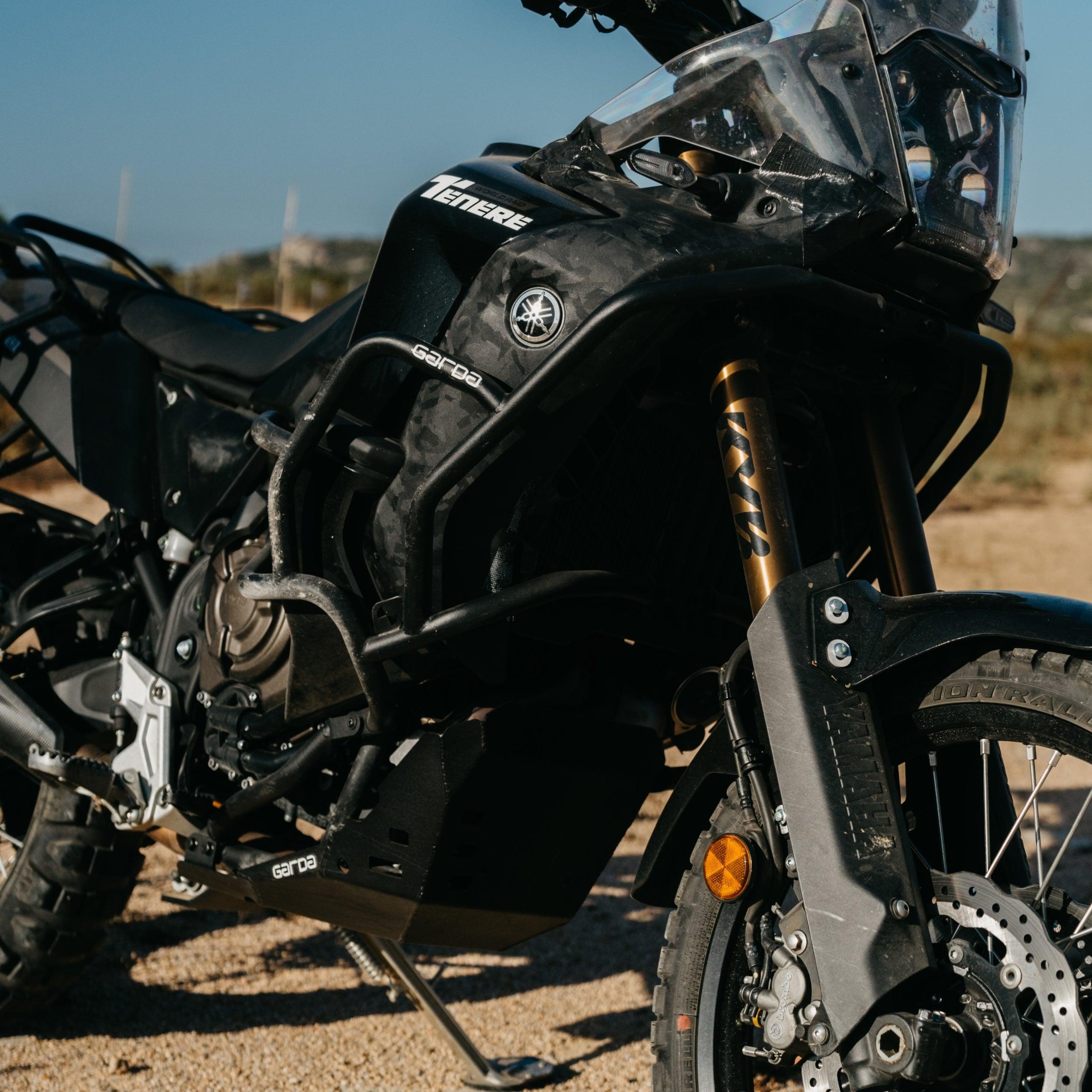 GARDA MAX crash bars Yamaha Tenere World Raid. They are designed to protect the motorcycle in the toughest conditions. The main part of them is 25x2mm pipe, which is designed to withstand heavy loads. The base of the crash bars are 4 support points per side, which gives us maximum support of the structure with optimal distribution of forces to all points. The whole thing was welded using the TIG method. We have tried to make the entire design as compact as possible to reduce air resistance while driving, and to reduce the weight of the structure.