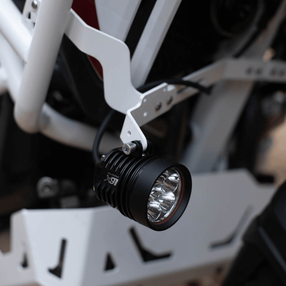 GARDA Adjustable Light Mount for the Honda Africa Twin motorcycle allows you to mount extra lights on the GARDA crash bars in adjustable way. It is possible to slide the halogens into the outline of the crash bars in such a way as to protect them from damage if the motorcycle is overturned.