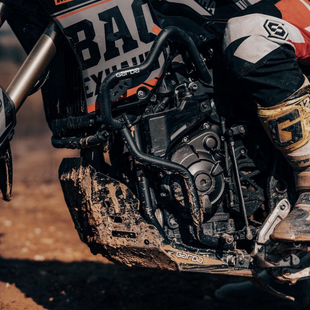 GARDA Skid Plate for Yamaha Tenere 700 provides protection for the most important parts of the motorcycle and will additionally provide protection for the frame and exhaust components from flying rocks from under the front wheel. We weld the shield on both sides to be sure that it will do its job even in the harshest conditions. In addition, all parts are sandblasted then powder coated to ensure a long product life. A 6mm thick high-density polyethylene (HDPE) sway bar protector is added to the aluminum cover, which will protect this protruding part of the suspension, but through its flexibility, will not interfere with its operation.
