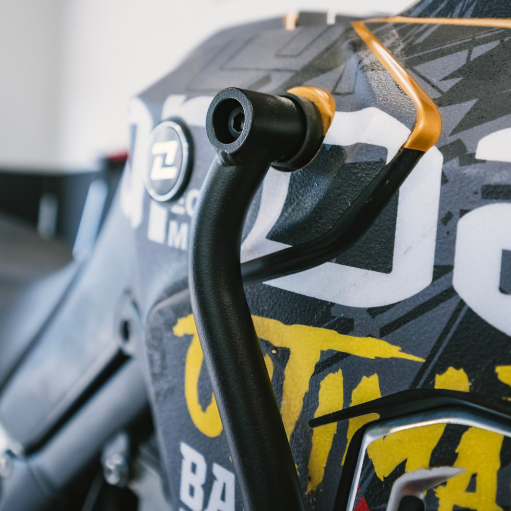 Weighing just 1.5 kg, they maintain the motorcycle’s agility. They are mounted directly to the frame, without touching the engine or radiator – ideal for the harshest rally conditions. Compatible with the GARDA skid plate, they complete the ultimate protection setup.